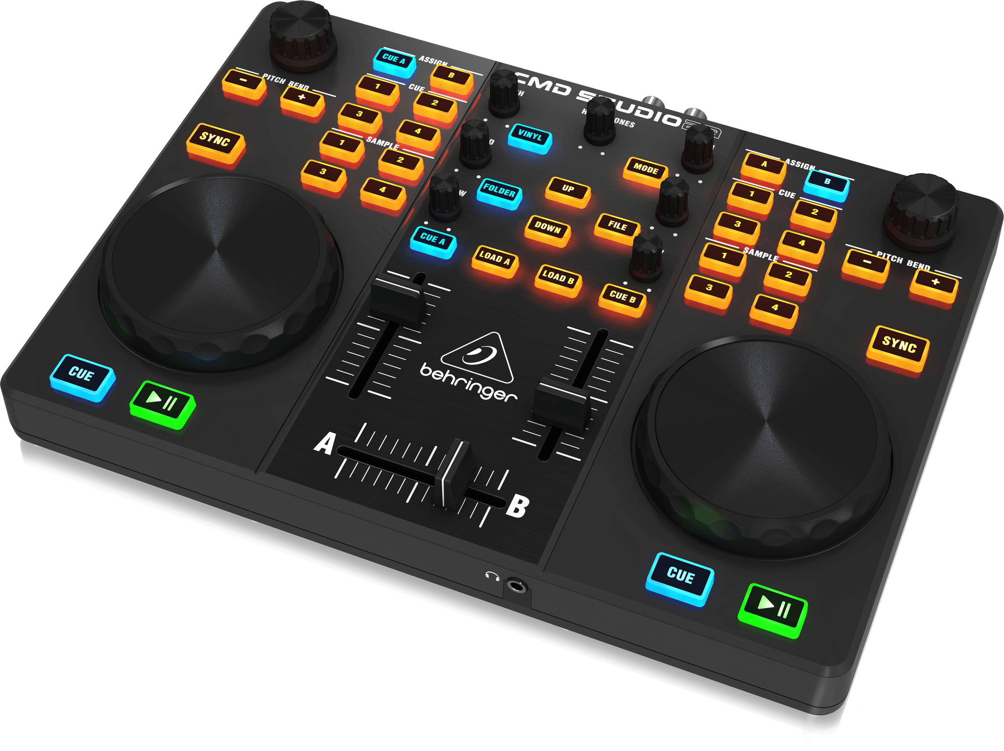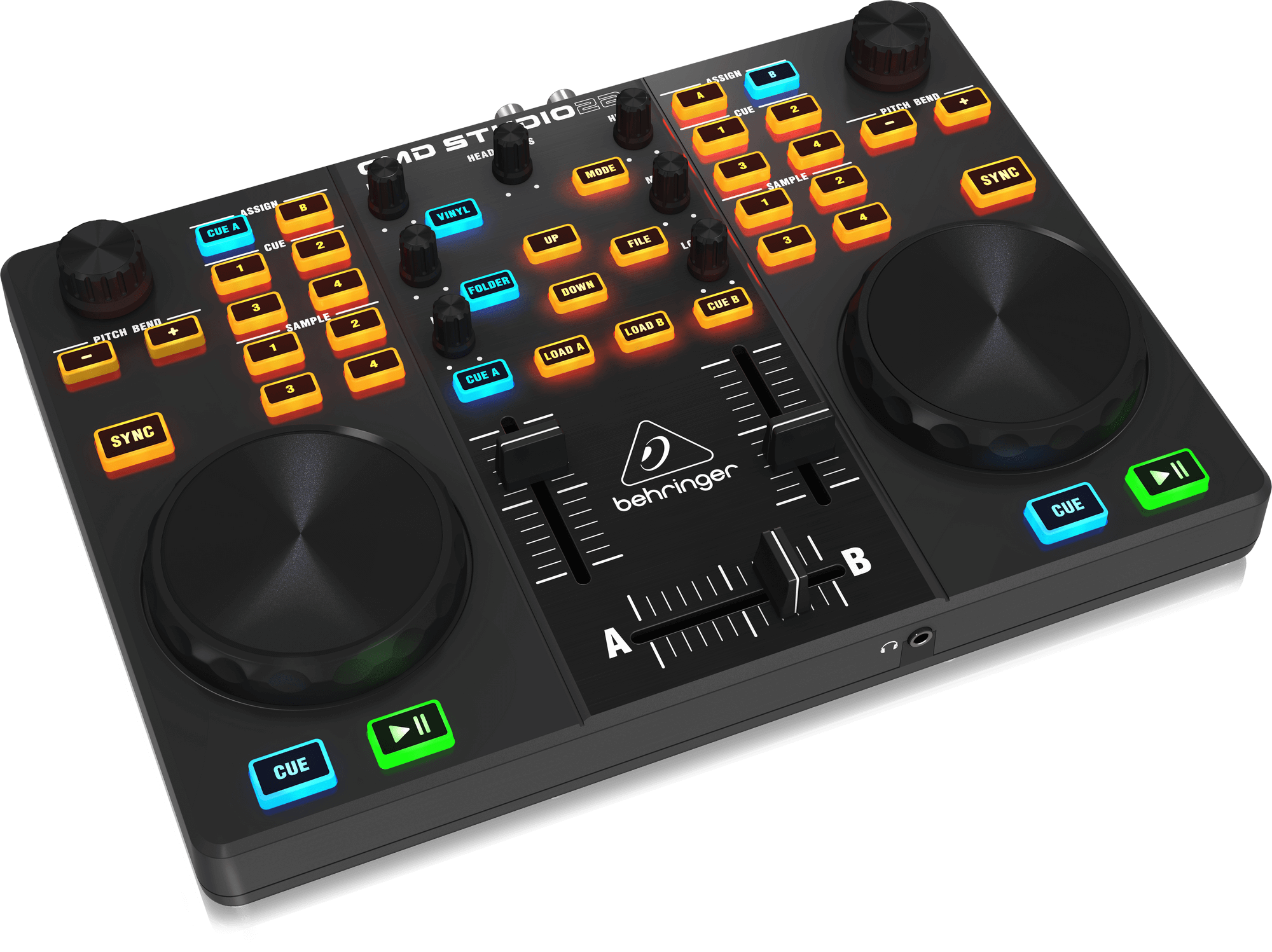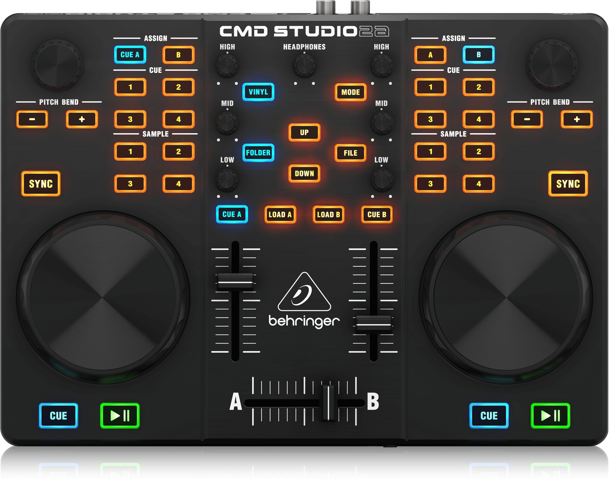 • Complete mixer section with crossfader and 2 channel faders, 3-band EQ, cue, library navigation and track load buttons