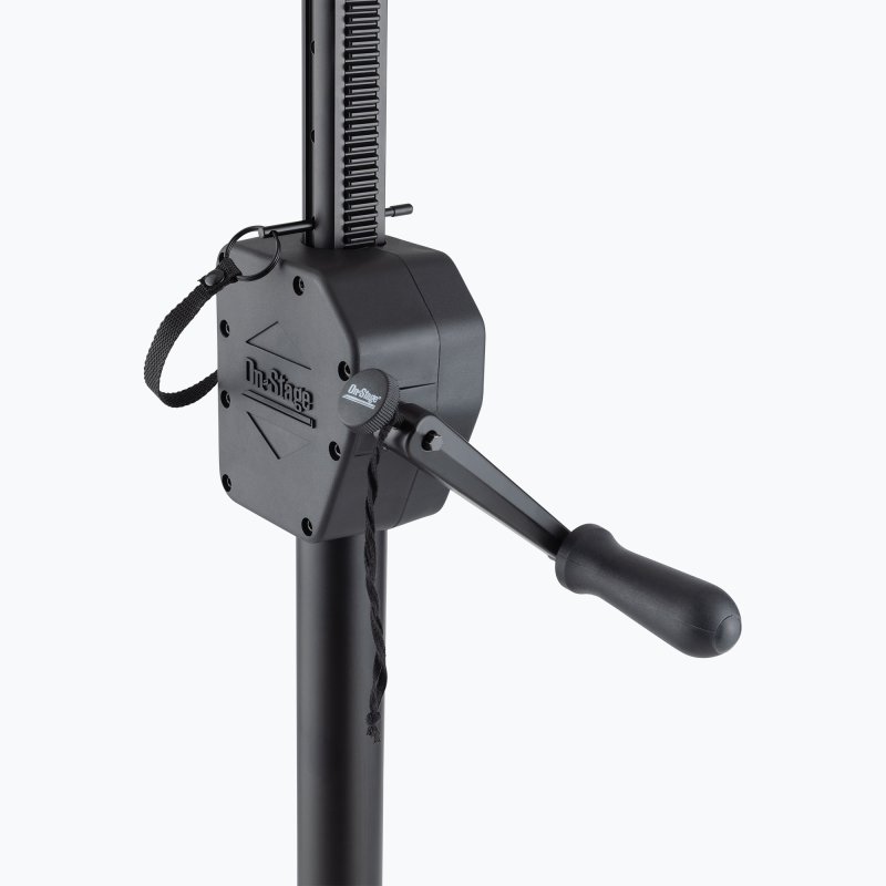 - Â Crank system supplies leverage for safely raising and lowering a mounted speaker